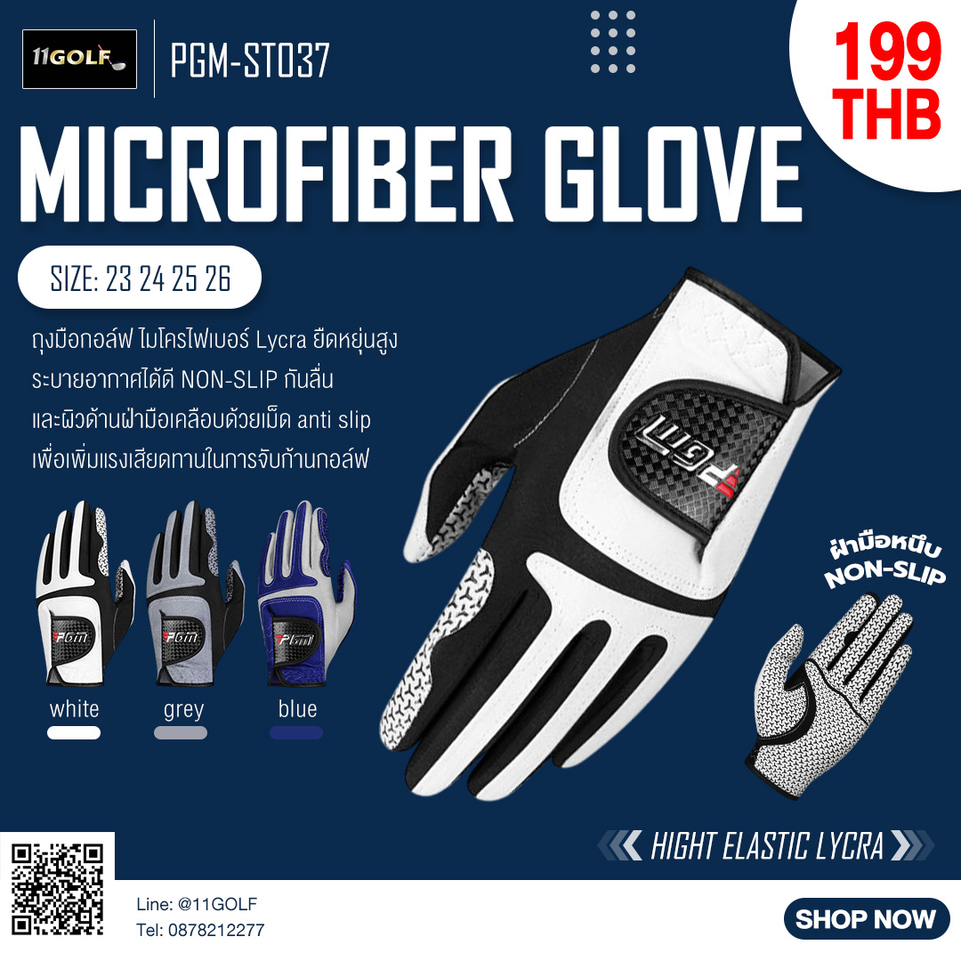 PGM MICROFIBER GLOVER มี SIZE 22 23 24 25 26 มีสีให้เลือก สีเทา สีขาว สีน้ำเงิน 1. มีความยืดหยุ่นสูง ผ้าไลคร่ายืดหยุ่นสูง นิ้วมีความยืดหยุ่นมากขึ้น 2. การออกแบบรูระบายอากาศ ผ้าไมโครไฟเบอร์ของนิ้
